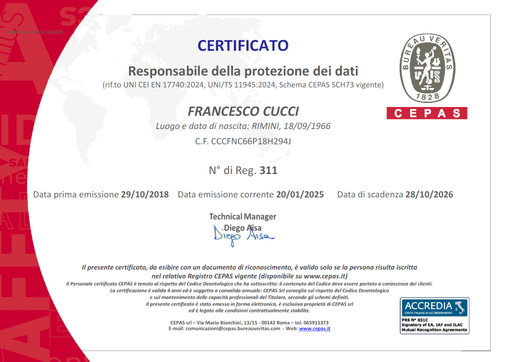 Attestazione superamento corso di perfezionamento post lauream in Cybersecurity and Data protection presso l’Università Politecnica delle Marche